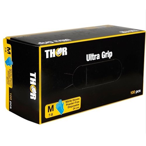 THOR Ultra Grip — vienreizējās nitrila cimdi, paredzēti profesionālai un mājsaimniecības lietošanai. Bez smaržas, bez lateksa, ražoti no 100% nitrila, izturīgi pret ķīmiskām vielām un plīsumiem. Tekstūrētās plaukstas svārki nodrošina lielisku saķeri un precizitāti darbus veicot.